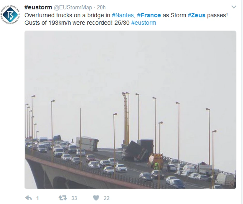 Oluja Zevs je pogodila zapad Francuske, a predveče se premeštala prema središtu i jugoistoku zemlje. Francuska meteorološka služba je na zapadnoj obali izmerila "nesvakidašnju" brzinu vetra od 193 km/h.