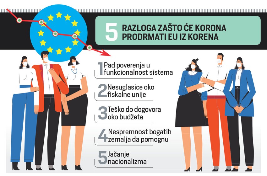 On navodi i da procene uticaja Covid-19 na ekonomiju EU predviđaju recesiju i pad BDP od 1 do 2,5 odsto u 2020, a pesimističke prognoze idu do 3,9 odsto, sa projekcijom mogućeg oporavka u 2021. Međutim, vidanju rana i pukotina EU mogao bi da se ispreči baš ono što je pojedinačno sačuvalo svaku od 27 zvezdica - nacionalizam. Baš to bi moglo da je navede na put samouništenja.