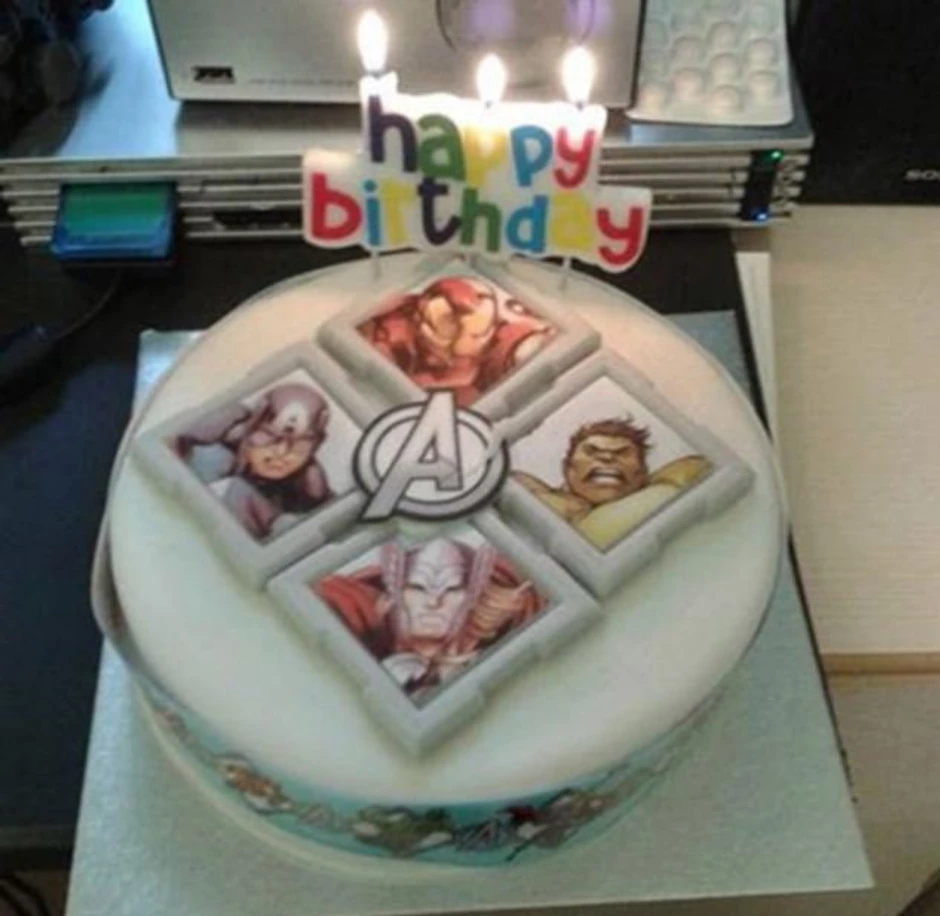 Na slici sa tortom se vidi konzola za igrice i stereo uređaj.