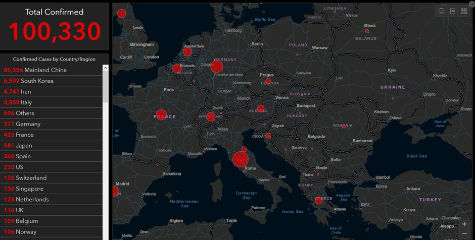 Ukupan broj zaraženih od korona virusa u svetu danas je zvanično premašio 100.000 i to za 393 slučaja. Današnjem rekordu doprineli su i Iran i Nemačka koji su u protekla 24 sata zabeležili velike skokove u broju zaraženih.