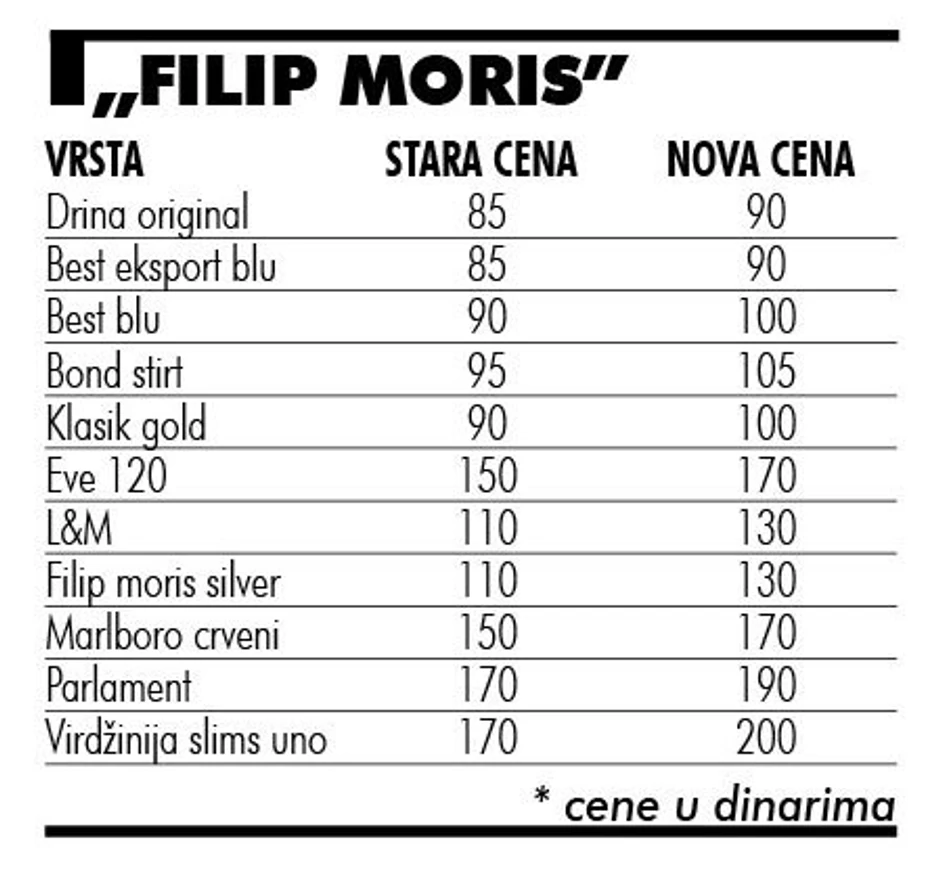 Akcize na cigarete su 1. januara uvećane sa 17,27 na 26 dinara po pakli, a novi cenovnik kompanije „Filip Moris“, formiran na osnovu akciznog uvećanja, na snagu je stupio dva dana kasnije. Po osnovu novog obračuna cena, za pet dinara poskupele su „drina original“, „best eksport“ i „best eksport blu“, za 10 dinara uvećane su cene „bonda“, „besta boks“, „besta blu“, „besta silver“ i „besta gold“, “klasika 100S” i „klasika blu“, „klasika gold“ i „klasika silver“. Za 20 dinara skuplji su „LM“, „asos slim“, „iv“, „parlament”, „filip moris“ i „marlboro“, a za 30 dinara cigarete „virdžinija slims uno“, koje sada po pakli koštaju 200 dinara.