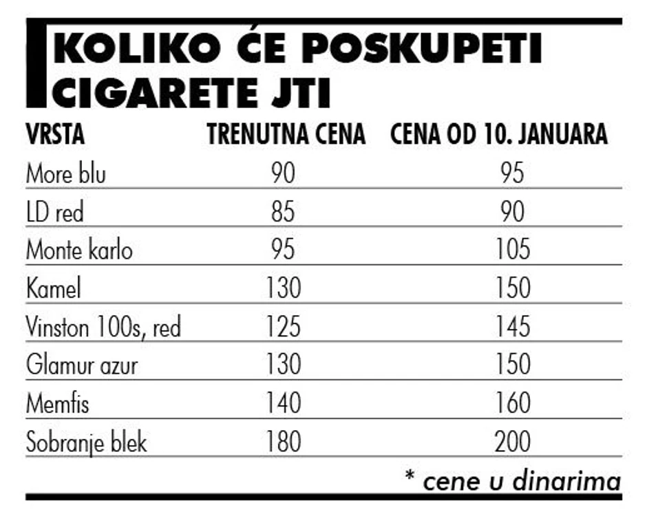 Iz kompanije “Japan tobako internešenel” poručuju da će njihove nove cene u maloprodaji zvanično početi da se primenjuju od 10. januara. Za pet dinara poskupeće cigarete „LD“ i „more“, za deset „monte karlo“, dok će za 20 dinara poskupeti „vinston“, „kamel“, „memfis“, „glamur“ i „sobranje“.