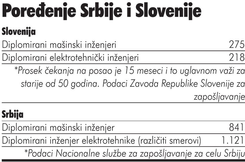 Inače, na posao elektroinžinjera prosečno se čeka 1,4 godine, a mašinca 1,5 godina. Slovenija nema problem sa zapošljavanjem ovih profila, pa se na njihovoj berzi rada trenutno nalazi 275 mašinaca i 218 elektroinžinjera, a mnogi među njima su stariji od 50 godina. U Nacionalnoj službi zapošljavanja kažu da nalaženje posla diplomiranim inženjerima elektrotehnike zavisi u velikoj meri od smera koji su završili.