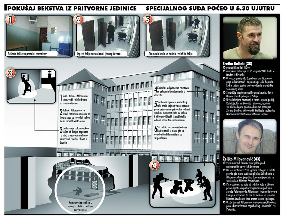 Prema zvaničnim podacima, Kalinić i Milovanović su juče u 5.30 krenuli da izlaze iz ćelija, tako što su prethodno pretesterisali malim testerama donji deo rešetke na ulaznim vratima u svoje ćelije. Spoljna vrata ćelije nisu bila zaključana.