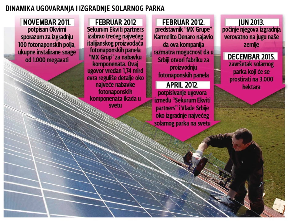 Luksemburški investicioni fond “Sekurum ekviti partners” odlučio je da u Srbiji izgradi solarni park, najveći na svetu, vredan 1,7 milijardi evra. Ugovor sa državom biće potpisan sledeće nedelje, posle čega će MX grupa, treći najveći proizvođač solarne opreme u Evropi, početi sa izgradnjom fabrike, otkriva za “Blic” menadžer fonda Ivan Matejak.
