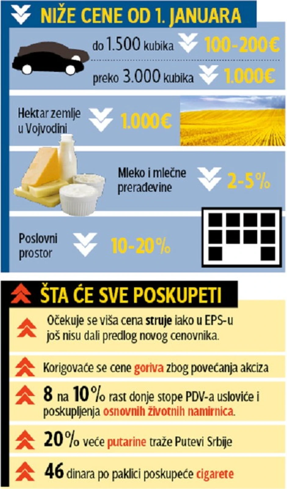 To važi i za građane koji su planirali da se zadužuju u bankama u domaćoj valuti ili kupe oranice. Jeftiniji će biti i mleko i mlečne prerađevine zbog smanjenja carina.Hektar obradive zemlje u Vojvodini, umesto 10.000 evra, verovatno će koštati hiljadu manje. Razlog je besparica među poljoprivrednicima.