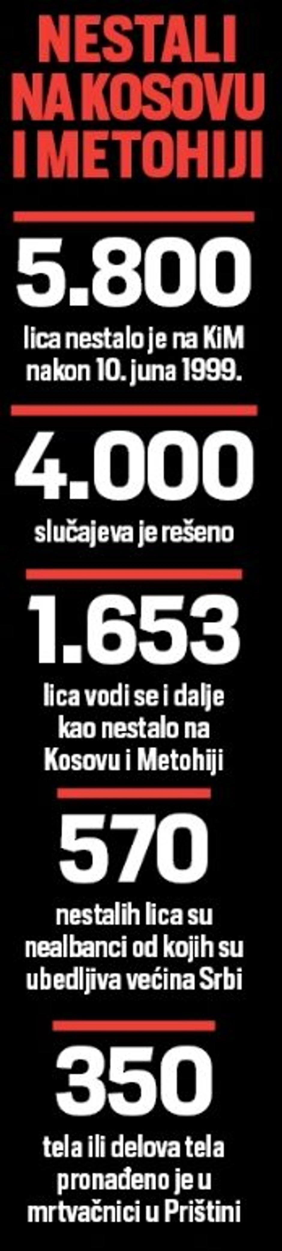 Od 1.653 lica koja su nestala na Kosovu i Metohiji, 570 su nealbanci, od kojih je ubedljivo najviše Srba, pokazuju podaci Međunarodnog komiteta Crvenog krsta. U mrtvačnici u Prištini nalaze se kosti 350 ljudi čiji se identitet može utvrditi samo DNK analizom.
