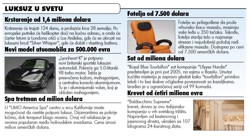 Dok većina Srba razmišlja kako da skrpi kraj s krajem, prodavci luksuzne robe zadovoljno trljaju ruke. Automobili, nakit, garderoba i basnoslovno skupa putovanja dobro se prodaju, a prodavci kažu da nisu strepeli od krize jer se “ono najskuplje u Srbiji uvek prvo proda”. U 2011. prodato je 516 “mercedesa” (od kojih je najskuplji S500 - 150.000 evra), brzo su rasprodati „samsung“ 3D televizori od 524.999 dinara, dok je jedan Beograđanin dao 68.000 evra da bi na devet dana rezervisao malo grčko ostrvo.