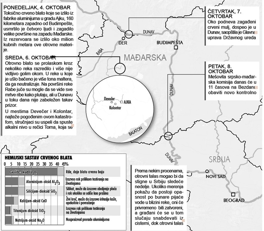 Otrovni boksitni crveni mulj, koji se pre pet dana izlio iz rezervoara fabrike aluminijuma u mestu Ajki na zapadu Mađarske, ulio se juče oko podne u Dunav. U Srbiji su prva merenja pokazala da nema povećanja zagađenosti, a nadležni tvrde da ljudski životi neće biti ugroženi i da za sada nema mesta panici.