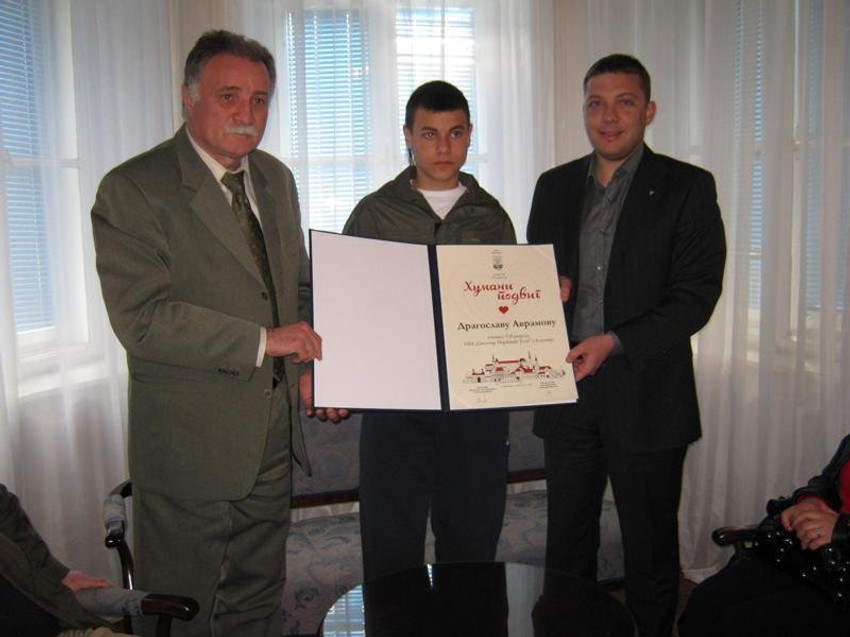 Za Dragoslava i njegove drugare juče je u Plavom salonu Gradske kuće organizovan prijem, a tom prilikom gradonačelnik Zrenjanina dr Mileta Mihajlov i predsednik Skupštine grada Zrenjanina Aleksandar Marton uručili su mu posebnu Plaketu za humani podvig.