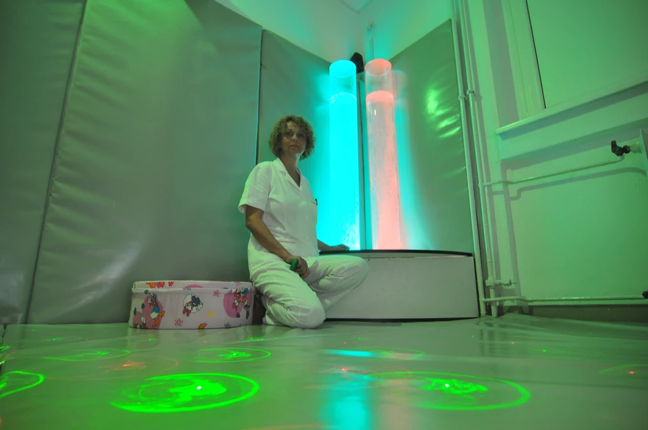 - Za decu sa poremećajem vida koristimo razne vizualne efekte. Tu su laseri koji projektuju vesele slike, svetlosne tube koje privlače pažnju i opuštaju decu, a preko video-bima prikazujemo i slike koje su deci zanimljive. Za razvoj sluha deci često puštamo zvuke životinja i ambijentalnu muziku, koja je odlična za psihoterapijski rad do te mere da se deca opuste, legnu u lejzi beg i uživaju - kaže Lalović Zekić. Takva soba pomaže i u terapiji poremećaja dodira.