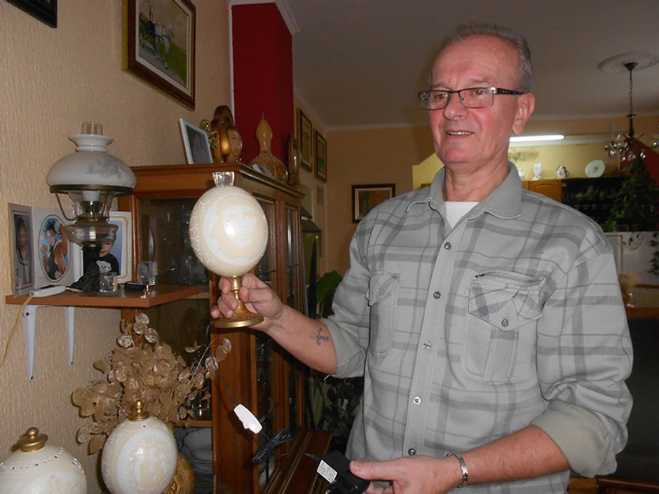 - Nojevo jaje se prvo očisti, dezinfikuje i izvuče se opna iz njega, jako pažljivo, pomoću dva magneta. Potom se rezbari ili oslikava. Debljina ljuske nojevog jajeta je 2 do 3 milimetra, što dozvoljava rezbarenje. Da bi mu dodao malo kontrasta koristim pirografiju kako bi osenčio pojedine delove. Nojeva jaja su kao porcelan, najsličnija su njemu, banatska su, nabavljam ih sa jedne farme u Zrenjaninu - nastavlja naš sagovornik.