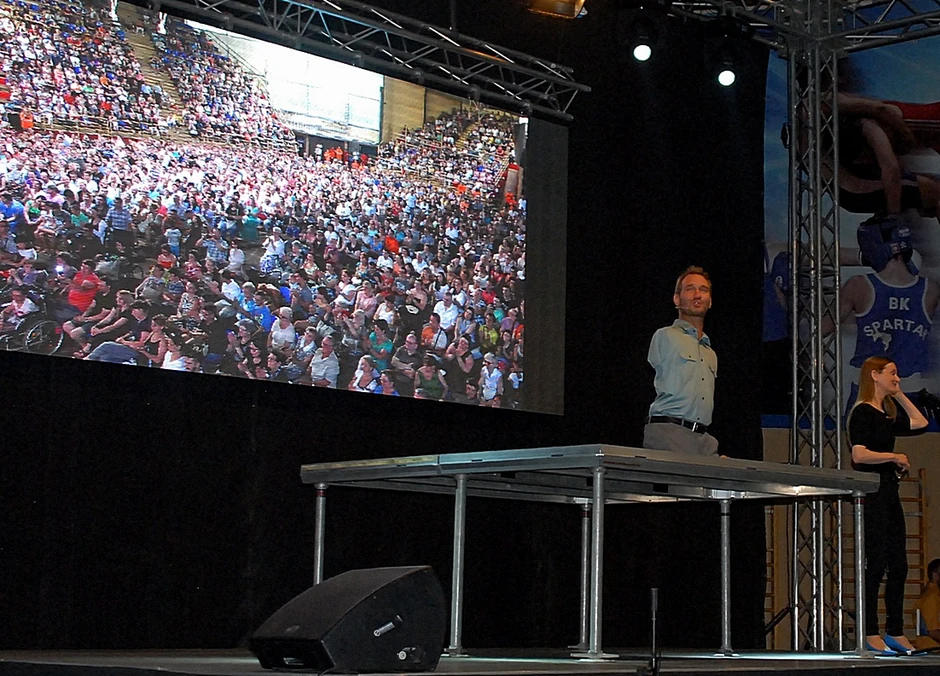 Nika Vujičića, rođenog bez ruku i nogu, koji je obišao više od 60 država i govorio pred više miliona ljudi da bi vedrinom uticao na svet, u Subotici su najavili kao "čoveka sa verom koji iako ne može da pruži zagrljaj je osoba koja je primila najviše zagrljaja na svetu".