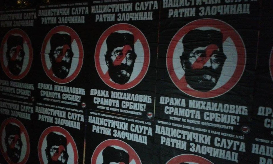 Na plakatima piše „Nacistički sluga, ratni zločinac, Draža Mihailović sramota Srbije!“.