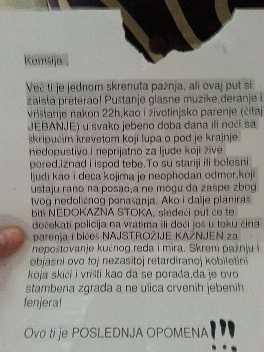 Glasno puštanje muzike u kasnim satima, kao i vrištanje tokom seksualnog odnosa primoralo je jednog stanara da uputi javnu poruku jednom od komšija.