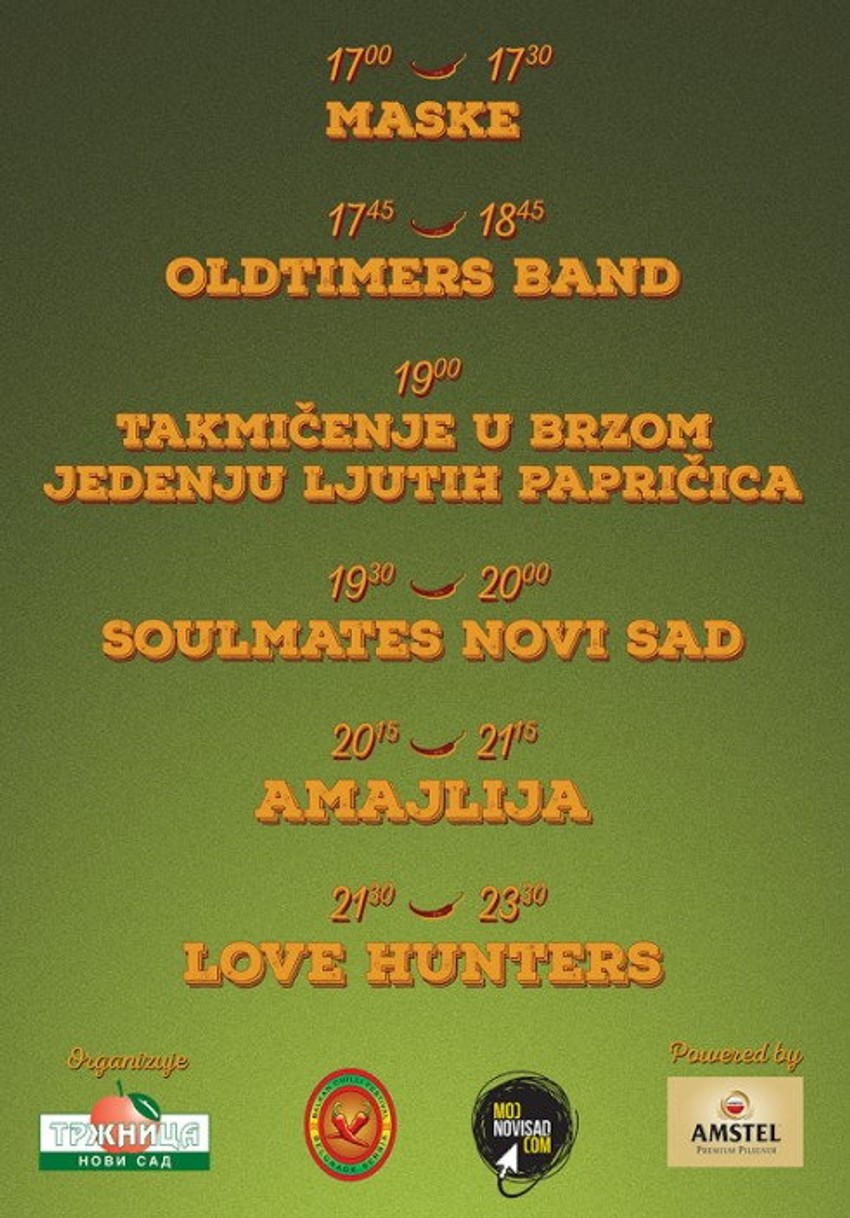 Na Ribljoj pijaci od 17 časova, Novosađani će imati priliku da na jednom mestu uživaju u nastupima bendova Oldtimers, Soulmates, Amajlija i Love Hunters, ljutoj hrani i Amstel Premium Pilsener pivu po promotivnoj ceni.