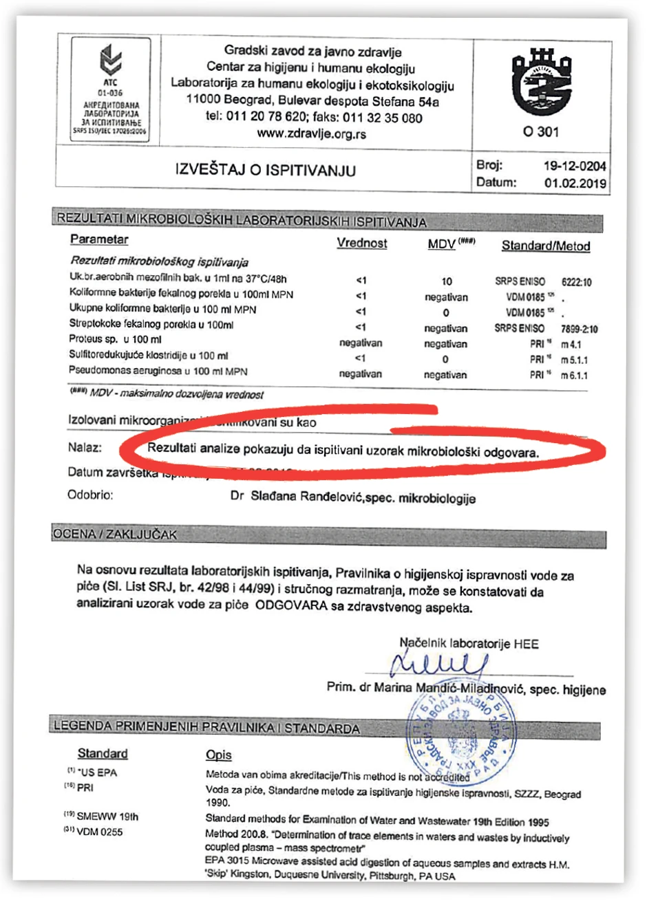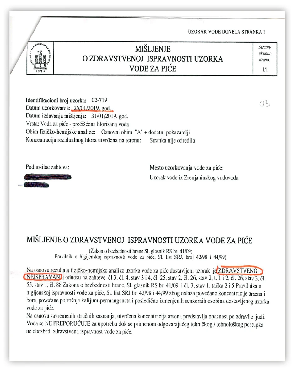 - Prvo smo uradili osnovna ispitivanja, a zatim dodatna na natrijum, bor i arsen. Uzorci su označeni kao neispravni. Ono što posebno zabrinjava jeste da je poslednji uzorak uzet 25. januara bio najlošiji od svih, odnosno, činjenica da umesto da se kvalitet vode popravlja, on s vremenom postaje gori. Taj poslednji uzorak pokazuje da je koncentracija bora iznad dozvoljene, a koncentracija arsena više nego duplo veća od dozvoljene. Zaključak koji se nameće jeste da kvalitet vode zavisi od mesta i vremena uzorkovanja. Možda i može da se postigne zadovoljavajući kvalitet vode na primopredajnom mestu (fabrika/vodovodna mreža), što je uslov za početak prodaje, ali smo sasvim sigurno daleko od kvaliteta vode u našim domaćinstvima, što je uslov koji se mora ispuniti da bi se ukinula zabrana – kažu u Građanskoj inicijativi "Zajedno za vodu".