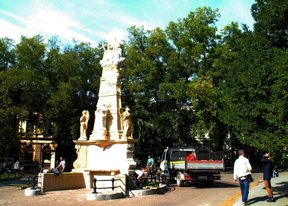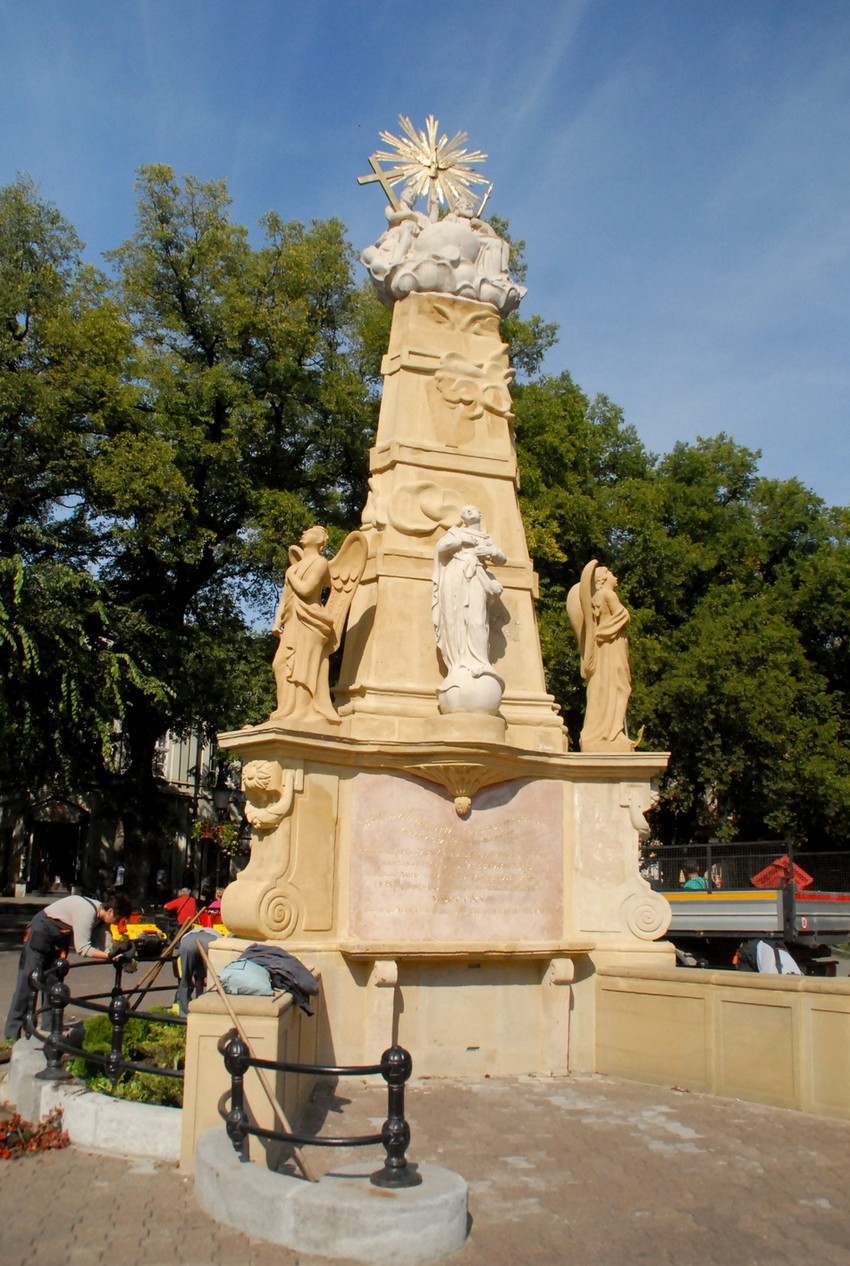 Restaurirano delo somborskog majstora Karla Salcera iz 1815. godine je sa mesta kod Katedrale, gde se nalazilo od 1964. godine, vraćeno na staru lokaciju na inicijativu Nacionalnog saveta Mađara. Spomenik je napravljen u obliku tri postolja sa figurama svetaca. Ima ploču sa natpisom, dva anđela i lik Svetog Mateja. Na vrhu je skulptura Sveto trojstvo sa krstom i zracima od metala. Troškove restauracije i premeštanja, 7,5 miliona dinara, obezbedio je NSM uz pomoć mađarske Vlade, dok je za postavljanje iz gradskog budžeta izdvojeno 2,8 miliona dinara.