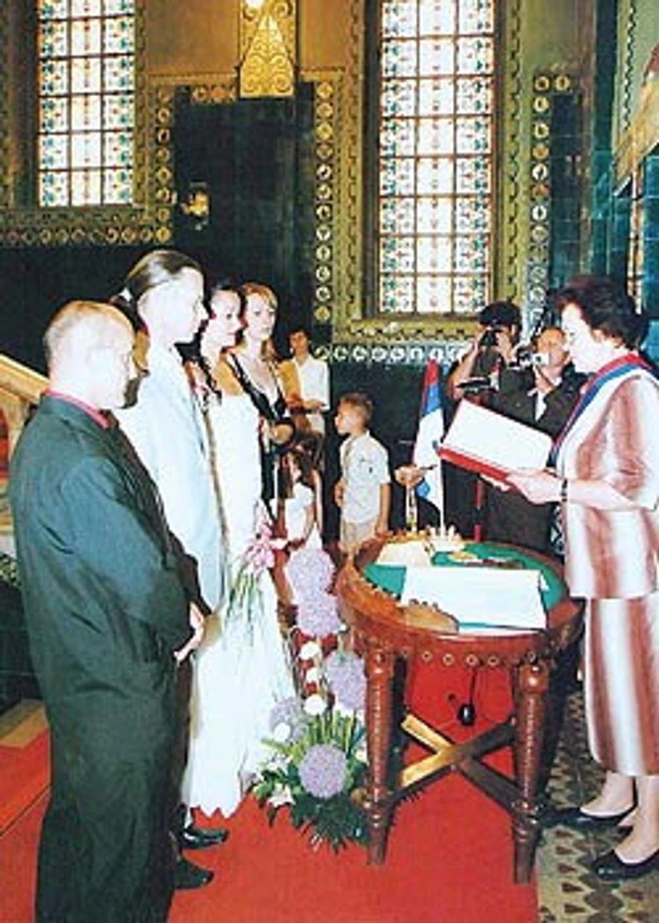 - I ja sam u petak bila obaveštena da se uveče u Velikoj većnici održava nekakav međunarodni simpozijum i da je prostor zauzet. Ponudili smo mladencima drugi termin, ali oni to nisu prihvatili. Kako se Plava sala kreči, setila sam se da smo nekada davno, prilikom renoviranja Velike većnice, mladence venčavali između dva stepeništa. To sam u nedelju predložila Šandoru i Dori i oni su, mada nevoljno, pristali. Matičari ne raspolažu Većnicom i ne znam čijom je krivicom došlo do prebukiranja sale. Znamo da je događaj bio neprijatan za sve, a imam saznanje da je već naloženo da se mladencima vrati novac koji su uplatili za venčanje u Većnici - kaže Vukosava Bogešić, glavna matičarka.