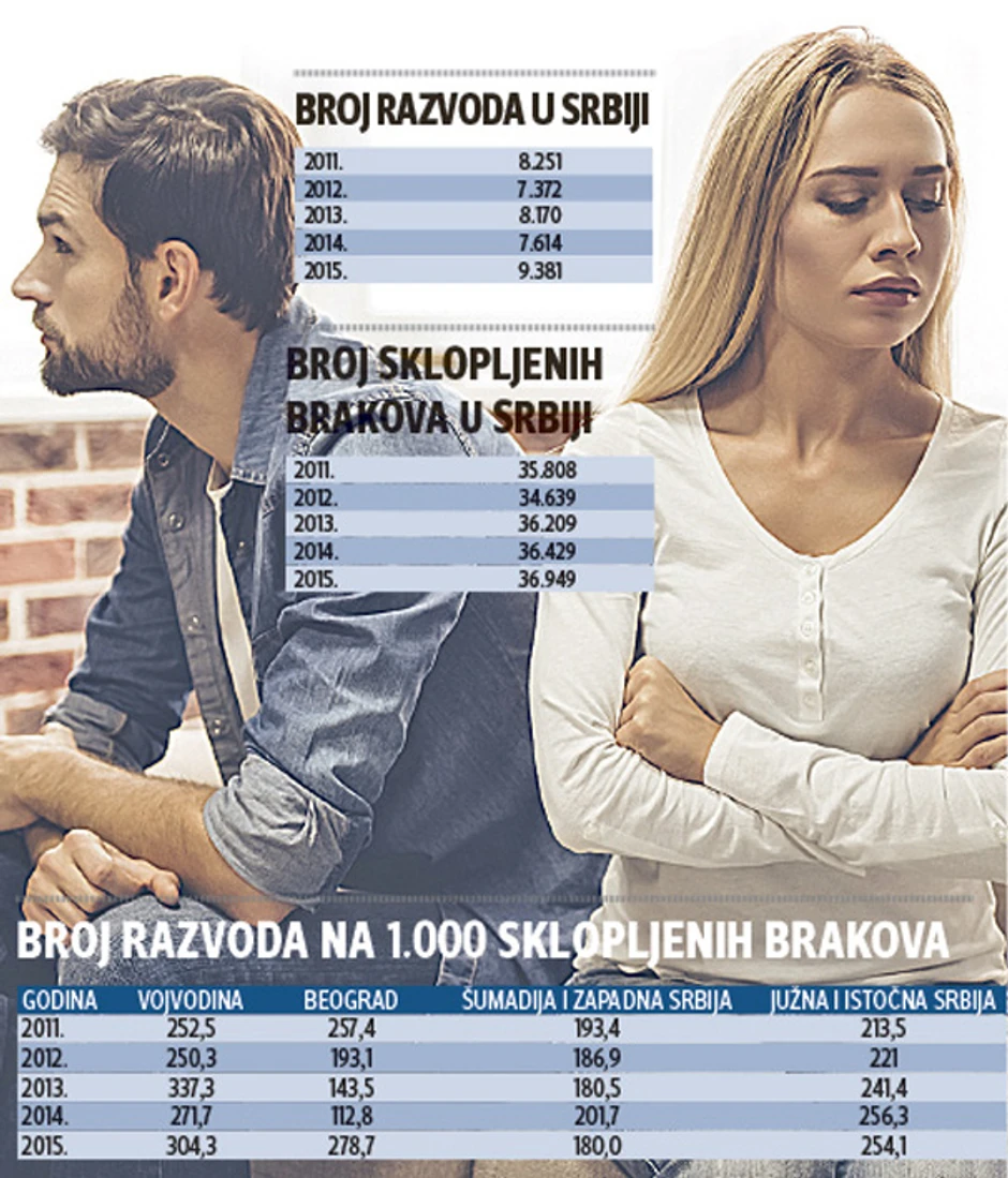 Broj razvoda u prošloj godini drastično je porastao u odnosu na prethodne godine. Dok se broj razvoda od 2011. naovamo kretao između 7.300 i 8.200, u 2015. je razveden 9.381 brak. Broj venčanja je u poslednje tri godine u stagnaciji i blagom porastu.