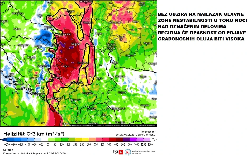 Poručuje da nema načina da se unapred zna gde će se te jake nestabilnosti pokrenuti, ali uz mape objašnjava da je "nad označenim delovima regiona u toku noći opasnost od gradonosnih oluja visoka".