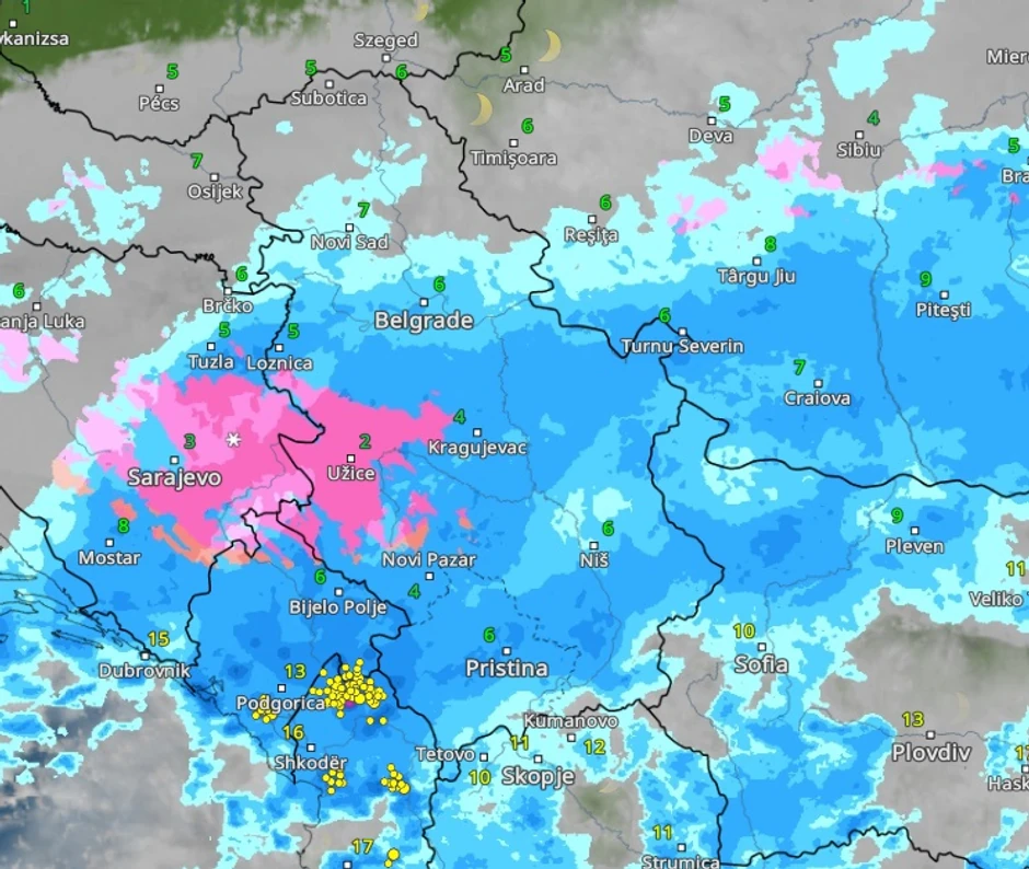 Podsetimo, snažno nevreme već je pogodilo Suboticu i okolinu Novog Sada, a padavine će se nastaviti tokom noći. Kako se vidi na radarskim snimcima sajta "Vreme i radar", intenziviranje padavina očekuje se oko 1 sat posle ponoći, dok će sneg početi da pada oko 8 ujutru i to u zapadnim delovima Srbije.