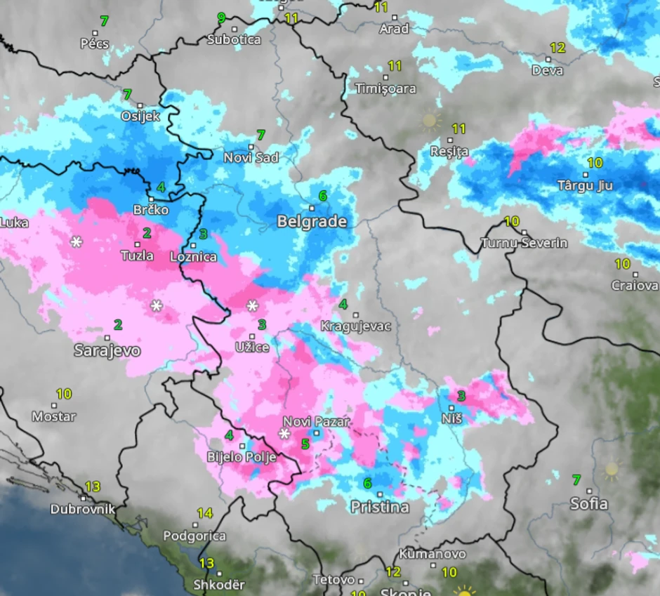 Kiša od ranog jutra pljušti u Srbiji, u pojedinim gradovima poput Svrljiga i Niša veje i sneg. Kako se vidi na radarskim mapama snežni oblaci (roze i ljubičasta boja) od 10 sati prekrivaju Loznicu i Užice, dok je Beograd bio pod gustom kišom (plava boja).