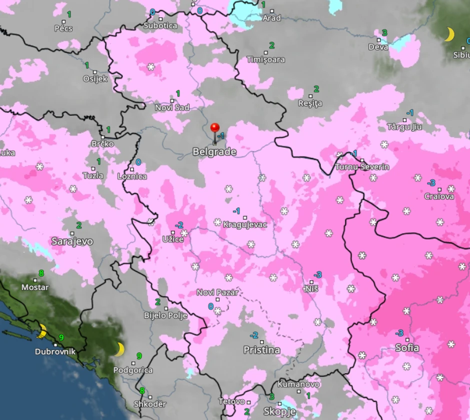 Sa Ristićevom prognozom slažu se i radarski snimci na sajtu Vreme radar, na kojima se može videti da će snežne padavine na jugu Srbije sutra početi već oko 7 sati ujutru. Tokom dana one će se premeštati ka severu zemlje, da bi se oko 17 časova skoro više od polovine zemlje zabelelo.