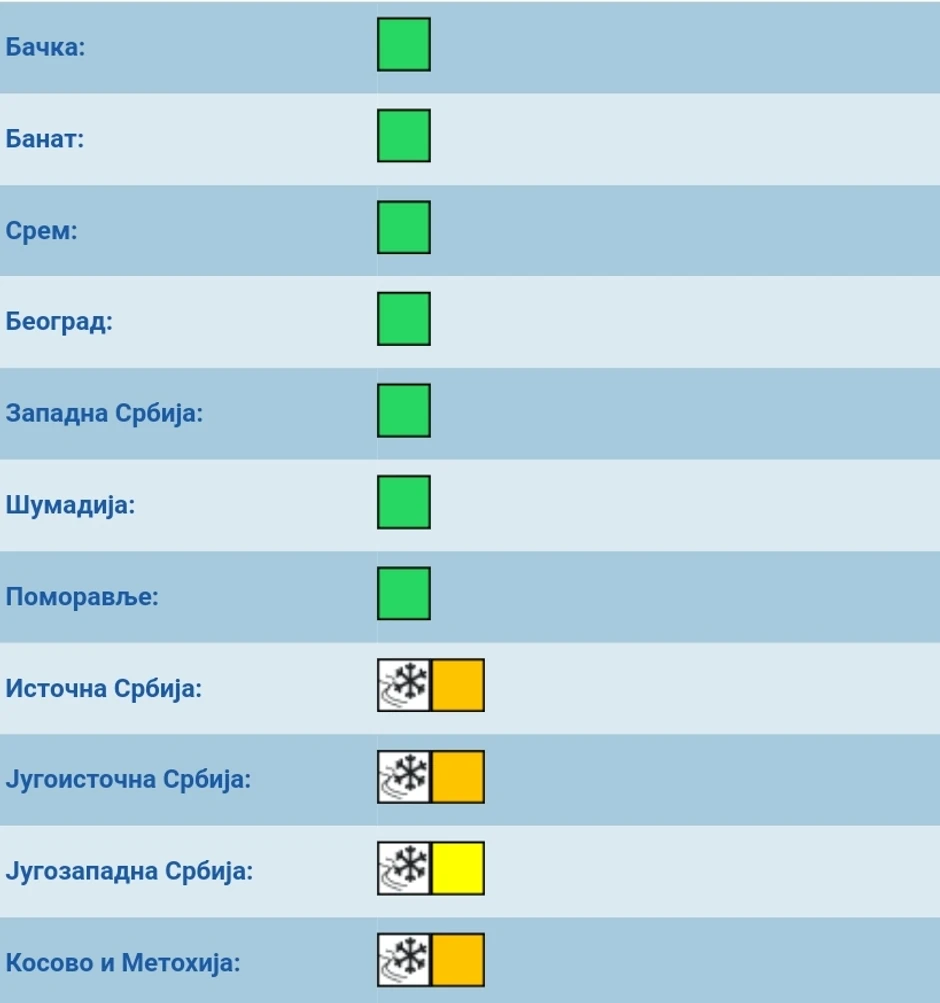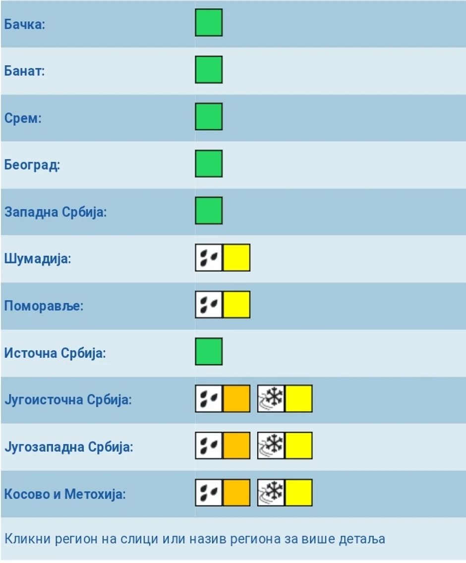 Danas poslepodne u brdsko-planinskim predelima jugozapadne, a tokom večeri i noći i južne i jugoistočne Srbije očekuje se prelazak kiše u sneg uz formiranje ili povećanje snežnog pokrivača.