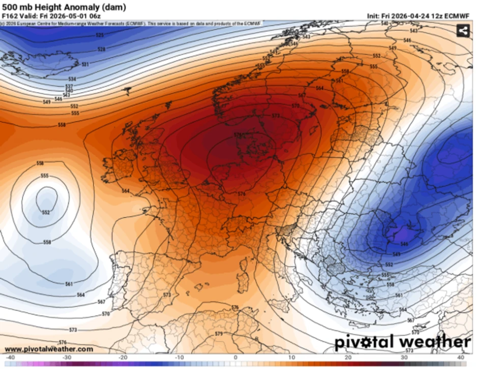 Do petka, 1. maja, jak anticiklon iznad Atlantika će se organizovati u klasičnu Omega blokadu. Istovremeno, dok će se hladnoća intenzivirati iznad Balkana i regiona Crnog mora, Zapadna Evropa i zapadni Mediteran ostaće pod uticajem toplije vazdušne mase, stvarajući oštar temperaturni kontrast širom centralnog dela kontinenta.