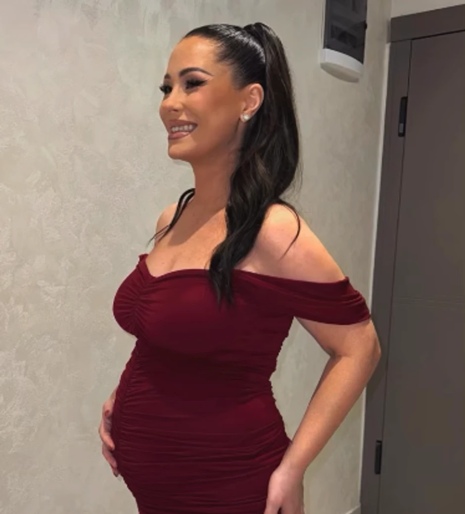 Naime, Aleksandra je na slici u uskoj bordo haljini, a trudnički stomak je u prvom planu, dok je evidentno da joj ovo stanje prija, te ne skida osmeh sa lica.