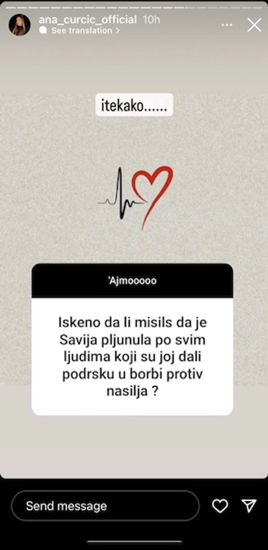 - Iskreno da li misliš da je Šavija pljunula po svim ljudima koji su joj dali podršku u borbi protiv nasilja? - glasilo je pitanje za nju, na šta se ona odmah složila.