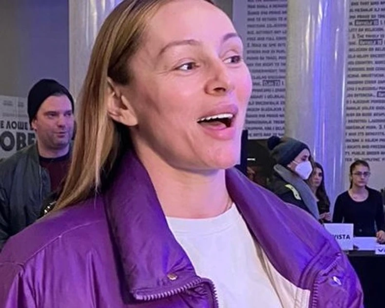Nekadašnja pevačica grupe "Fanki Dži" došla je u ljubičastoj jakni i beloj trenerci, a osmehom je pokazala kako se oseća.