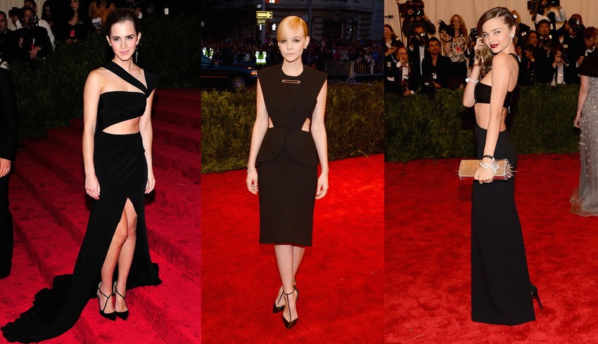 Ema Votson (Prabal Gurung), Keri Maligan (Balensijaga) i Miranda Ker (Majkl Kors) nosile su slične crne "isečene" haljine...