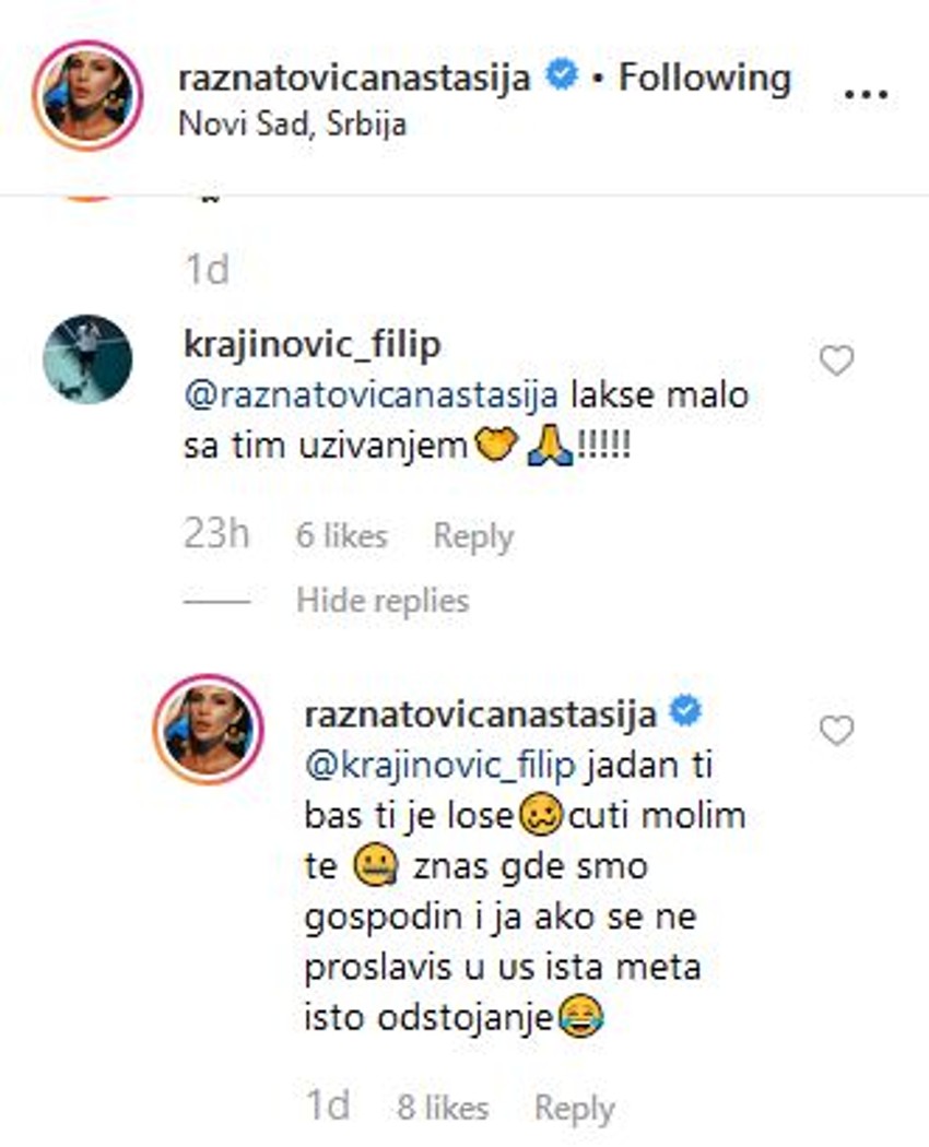 Među komentarima se našao i onaj od tenisera Filipa Krajinovića, koji se, po svemu sudeći, dopao Ražnatovićevoj.