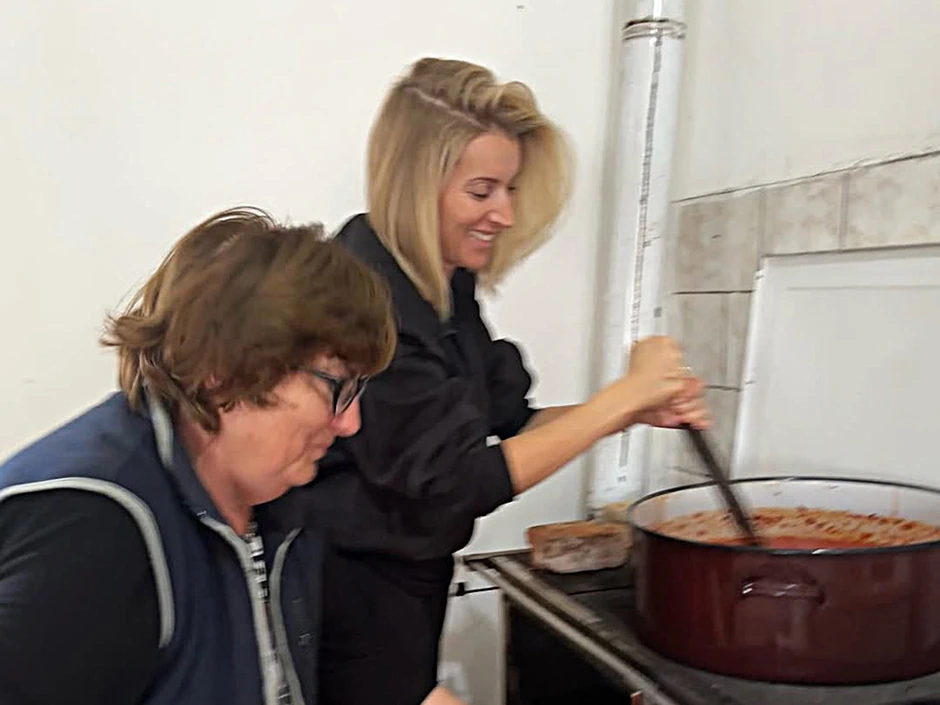 Tokom posete učestvovala je u spremanju zimnice sa svojom mamom.