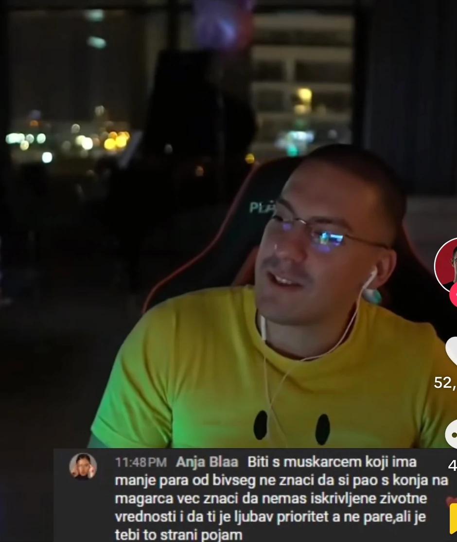 "Biti s muškarcem koji ima manje para od bivšeg ne znači da si pao s konja na magarca, već znači da nemaš iskrivljene životne vrednosti i da ti je ljubav prioritet, a ne pare. Ali je tebi to strani pojam", napisala mu je bivša devojka na lajvu.