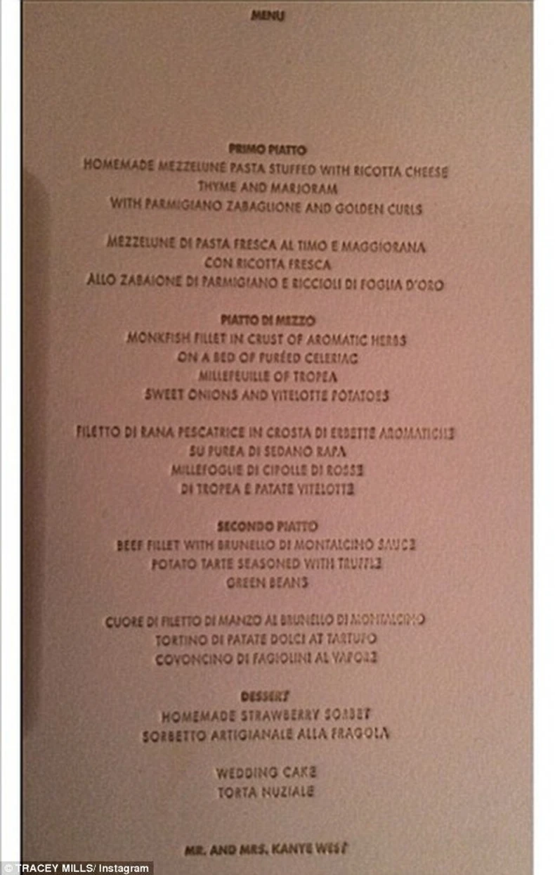 Meni koji je na prvi pogled običan, odnosno isprintan bazičnim fontom, na rustičnom papiru i naravno potpisan sa Gospodin i Gospođa Kanje Vesta na dnu, krije mnogo raznovrsne hrane za koju su neki rekli da je bila rajska.