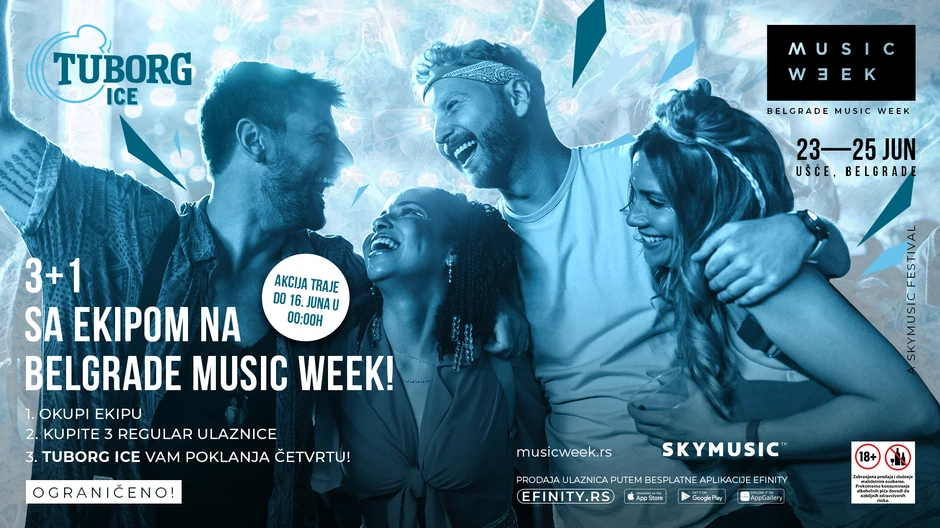 Omiljena akcija fanova Tuborg Ice 3+1 za Belgrade Music Week je počela! Ukoliko želiš da sa svojom ekipom uživaš u spektakularnim nastupima više od 30 superzvezda nove generacije koji kreiraju novo lice muzičke industrije, sve što je potrebno jeste da kupiš tri regular dnevne ulaznice po aktuelnim promotivnim cenama, a TUBORG ICE će te nagraditi četvrtom, GRATIS!