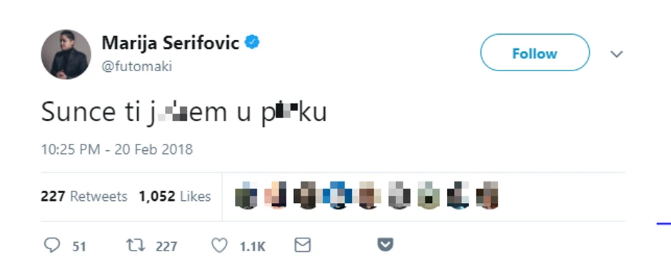 Marija Šerifović izazvala je skandal na društvenim mrežama, kada je objavila tvit koji svi prepričavaju. Ona je žestoko opsovala, iako nikome nije jasno o čemu je reč i zbog koga je napisala tako žestoku psovku.