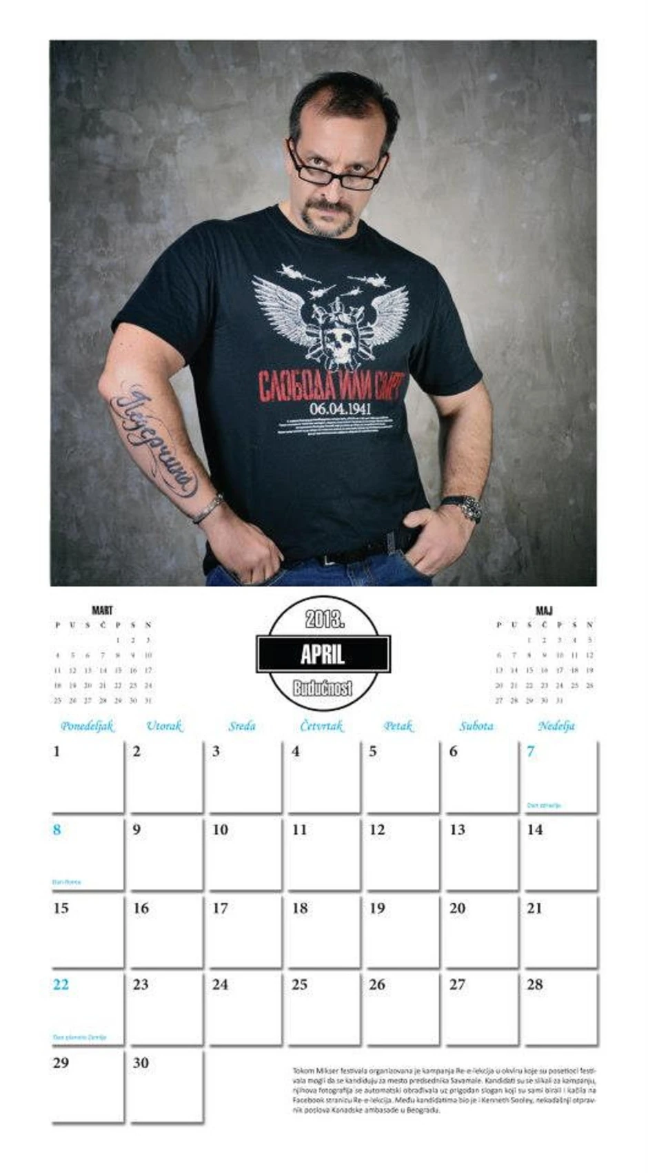 U kalendaru su se tako našli akteri filma „Parada“ i predstave „Izopačeni“, kao i učesnici uličnih performansa poput „lezbejskog venčanja“, ali i nekadašnji otpravnik poslova kanadske ambasade u Beogradu Kenet Suli, koji se slikao s tetovažom na kojoj ćirilicom piše „pederčina“.