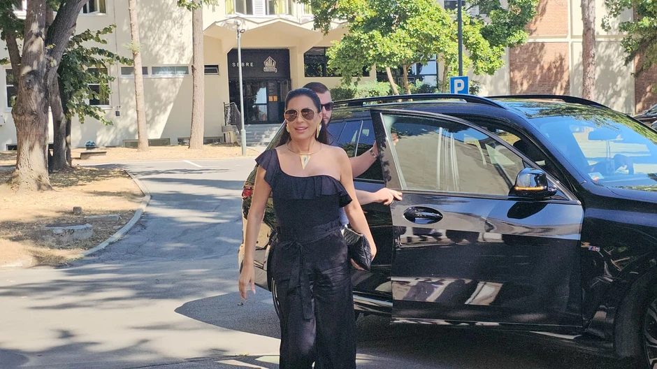 Ceca je stigla u besnoj mašini, a za ovu priliku odabrala je crne satenske pantalone, crnu bluzu na jedno golo rame, kao i crnu torbicu.