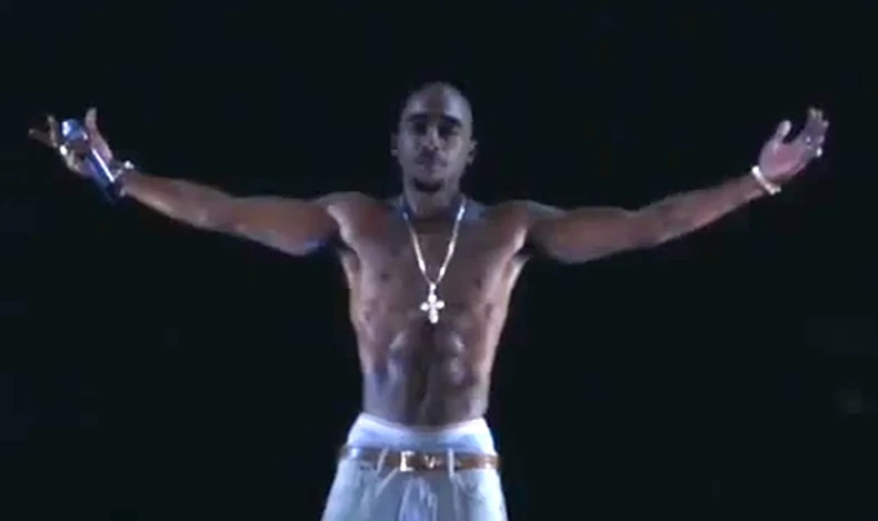 Posetioci „Coachella Valley Music & Arts” festivala bili su zapanjeni kada su na sceni ugledali pokojnog Tupaka, koji je u širokim pantalonama i bez majice izveo pesmu „Hail Mary”.