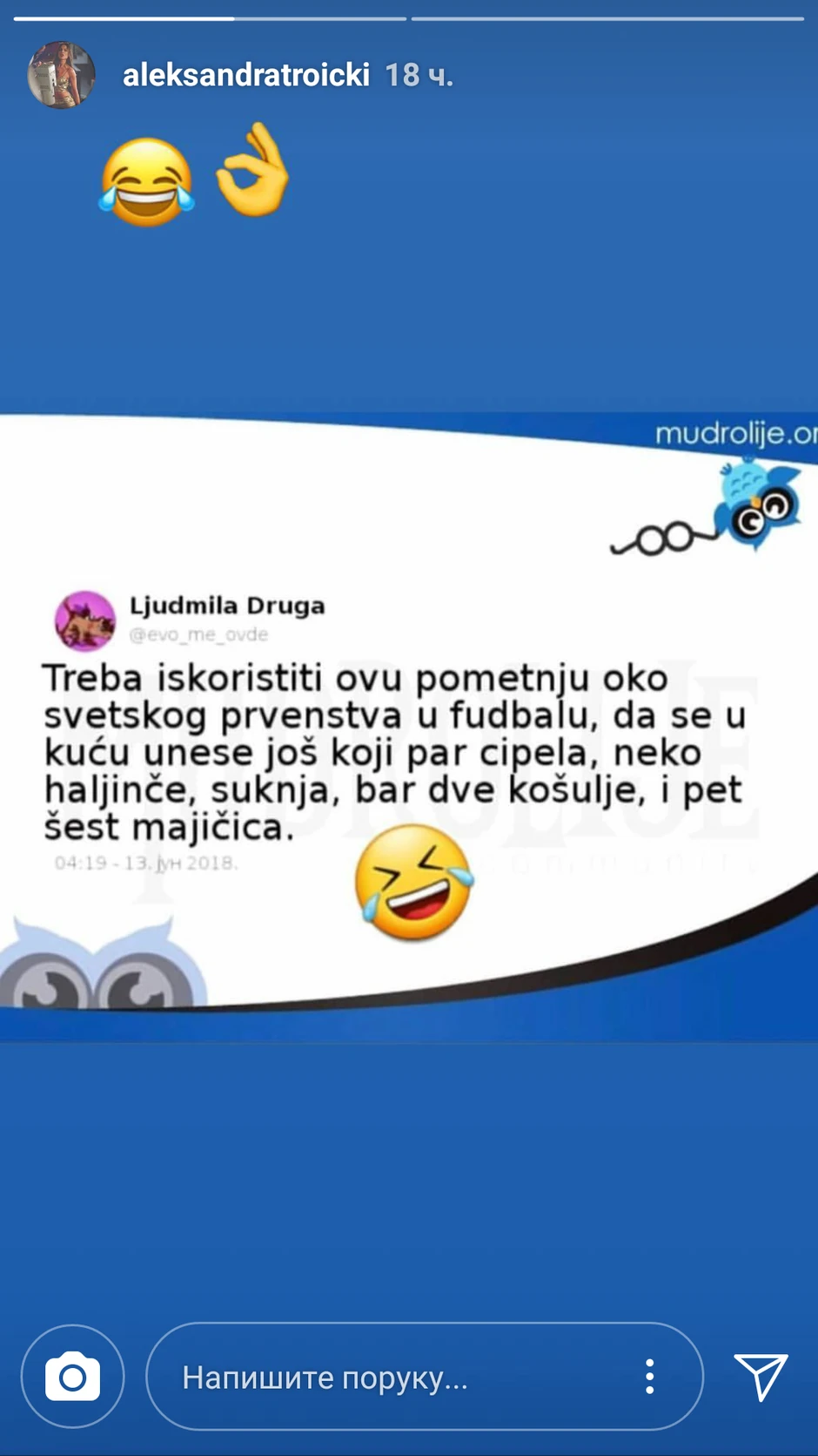 - Treba iskoristiti ovu pometnju oko Svetskog prvenstva u fudbalu, da se u kuću unese još koji par cipela, neko haljinče, suknja, bar dve košulje i pet-šest majičica - glasi tvit koji je Aleksandra podelila, a koji ju je očigledno izuzetno nasmejao. Kako će reagovati njen suprug, ali i pripadnici jačeg pola generalno, ostaje da vidimo.