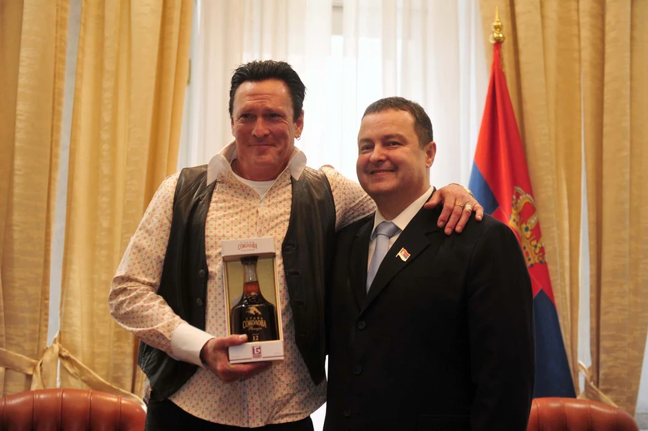 - Ovo je za vas, ja ne pijem - našalio se premijer dok je sa holivudskom zvezdom razmenjivao poklone. Na Dačićevo pitanje kako se provodi u Beogradu, glumac je rekao da "uživa u svakom trenutku".