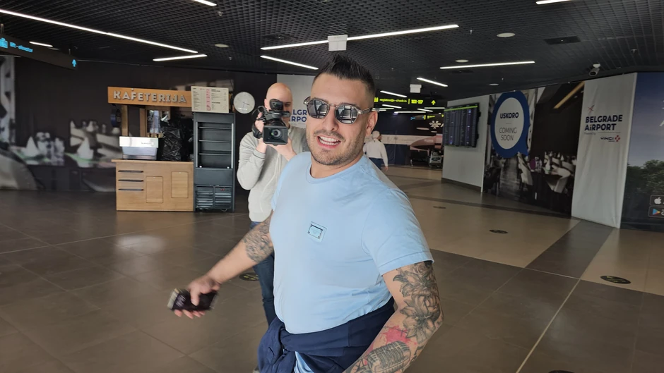 Pevača Darka Lazića uslikali smo danas na beogradskom aerodromu kada je bio vidno raspoložen.
