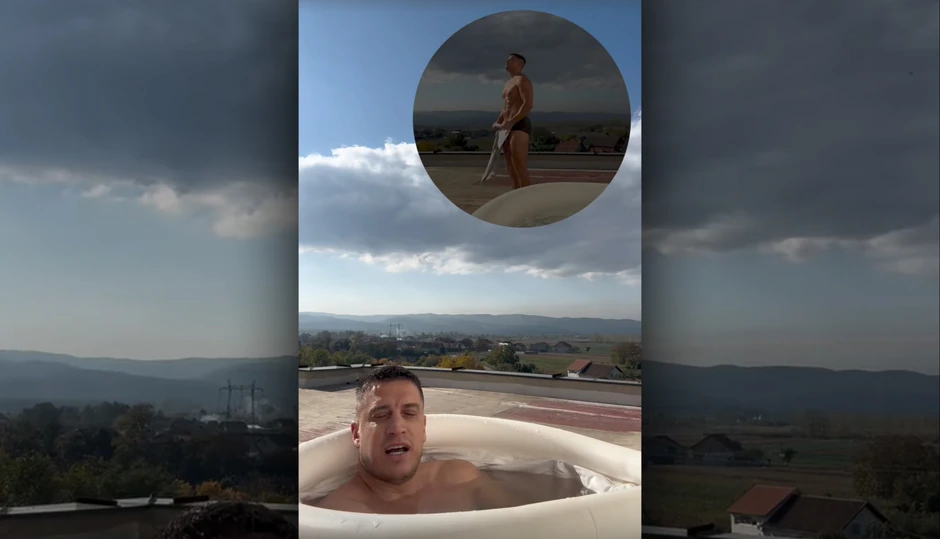 On je napravio takozvanu hladnu kupku, skinuo garderobu za sebe i uronio telo u ovu ne tako prijatnu vodu. Ipak, po njegovoj reakciji bi se reklo da i te kako uživa u ovom tretmanu.