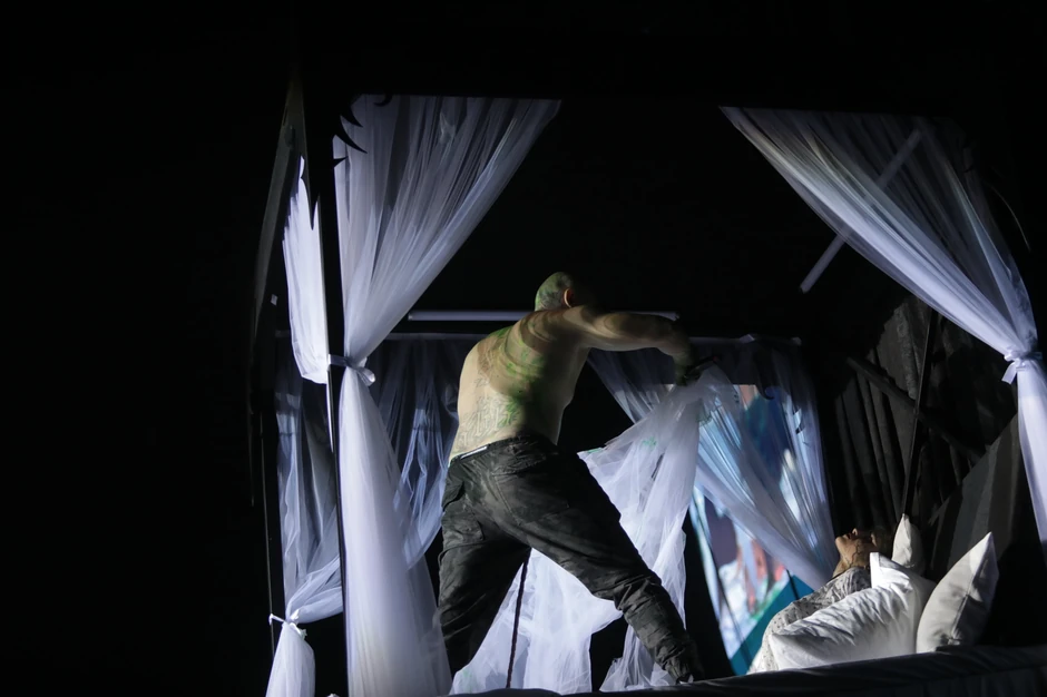 On je sve vreme pevao dok je skalao po krevetu ispred nje, bio je bez majice i poliven zelenom farbom.