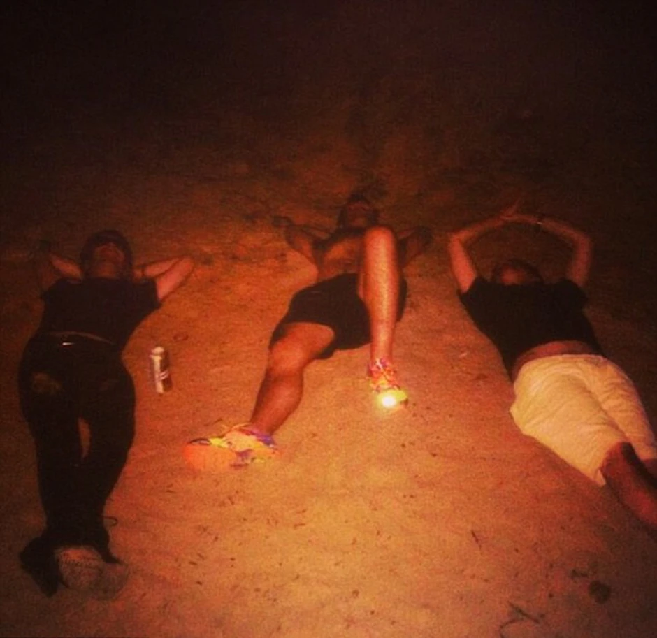 Fotografija prikazuje Galagera ispruženog na pesku sa prijateljima, dok pored njega stoji konzerva piva.