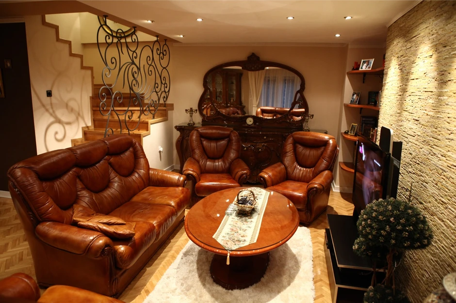 Veliki dnevni boravak, smeđa kožna garnitura, u ćošku polica s knjigama, na zidovima slike Olje Ivanjicki, stepenice ovde i tamo. Sve uglancano tip-top.